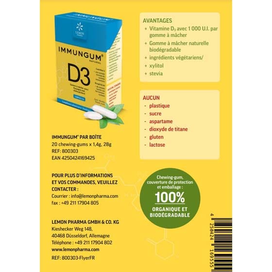 Chewing-gum Lemon Pharma IMMUNGUM® – vitamina D3 1000 UI – Xilitolo – Stevia – Vegano